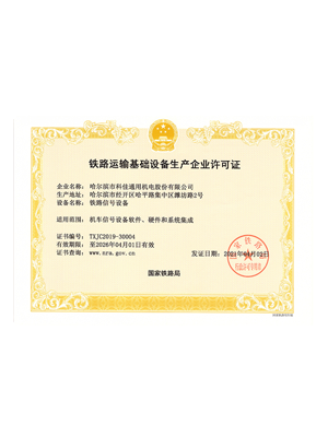 獲得國(guó)家鐵路局頒發(fā)“鐵路運(yùn)輸基礎(chǔ)設(shè)備(機(jī)車信號(hào))生產(chǎn)企業(yè)”行 政許可證書